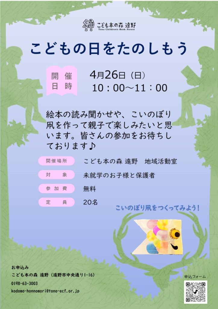 スタッフによる絵本の読み聞かせや、こいのぼり凧を作って親子で楽しみたいと思います。